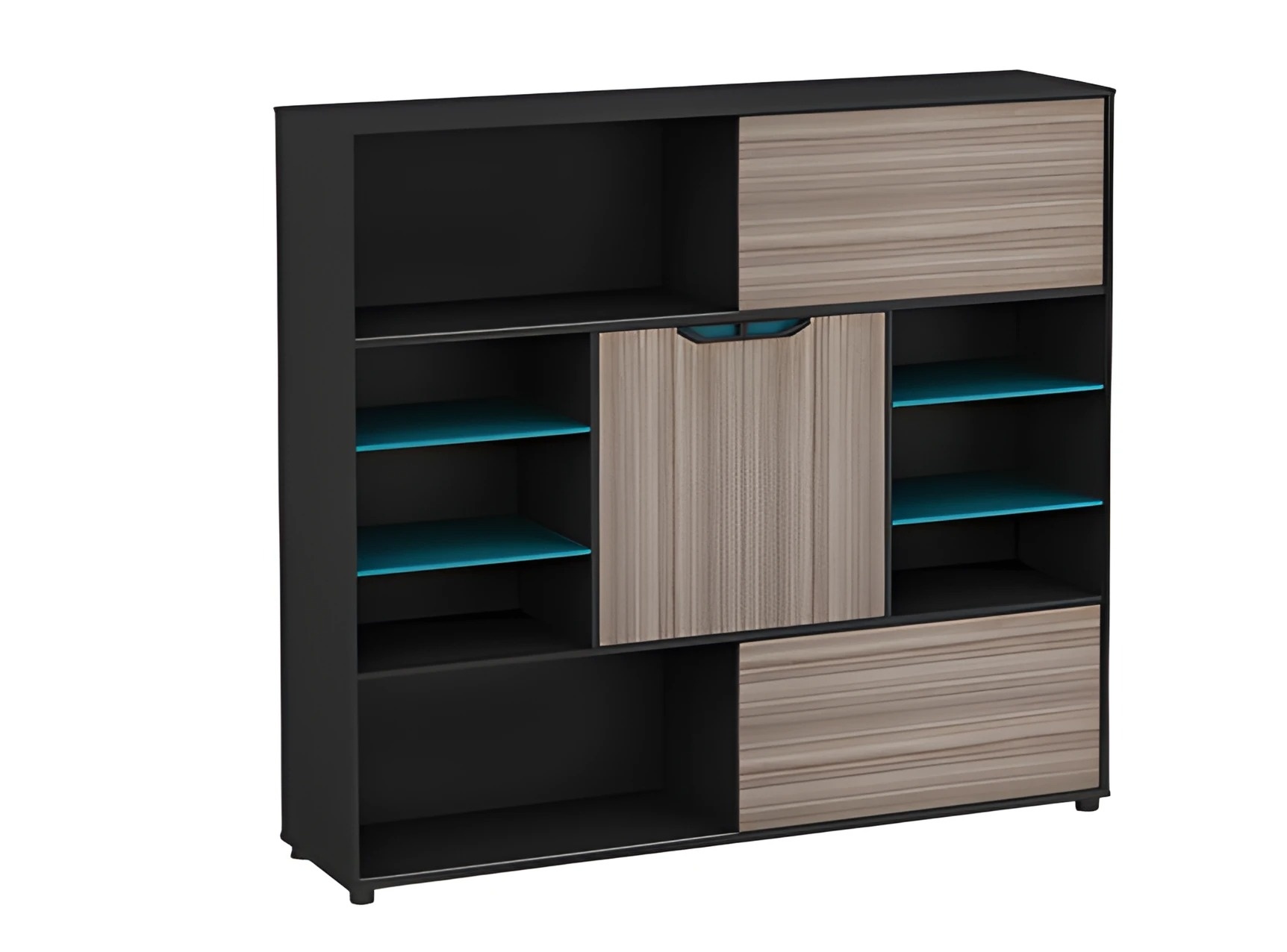 Mobilna komoda z drewna, brązowa i czarna, nowoczesna, z drzwiami i półkami, niebieska, do biura