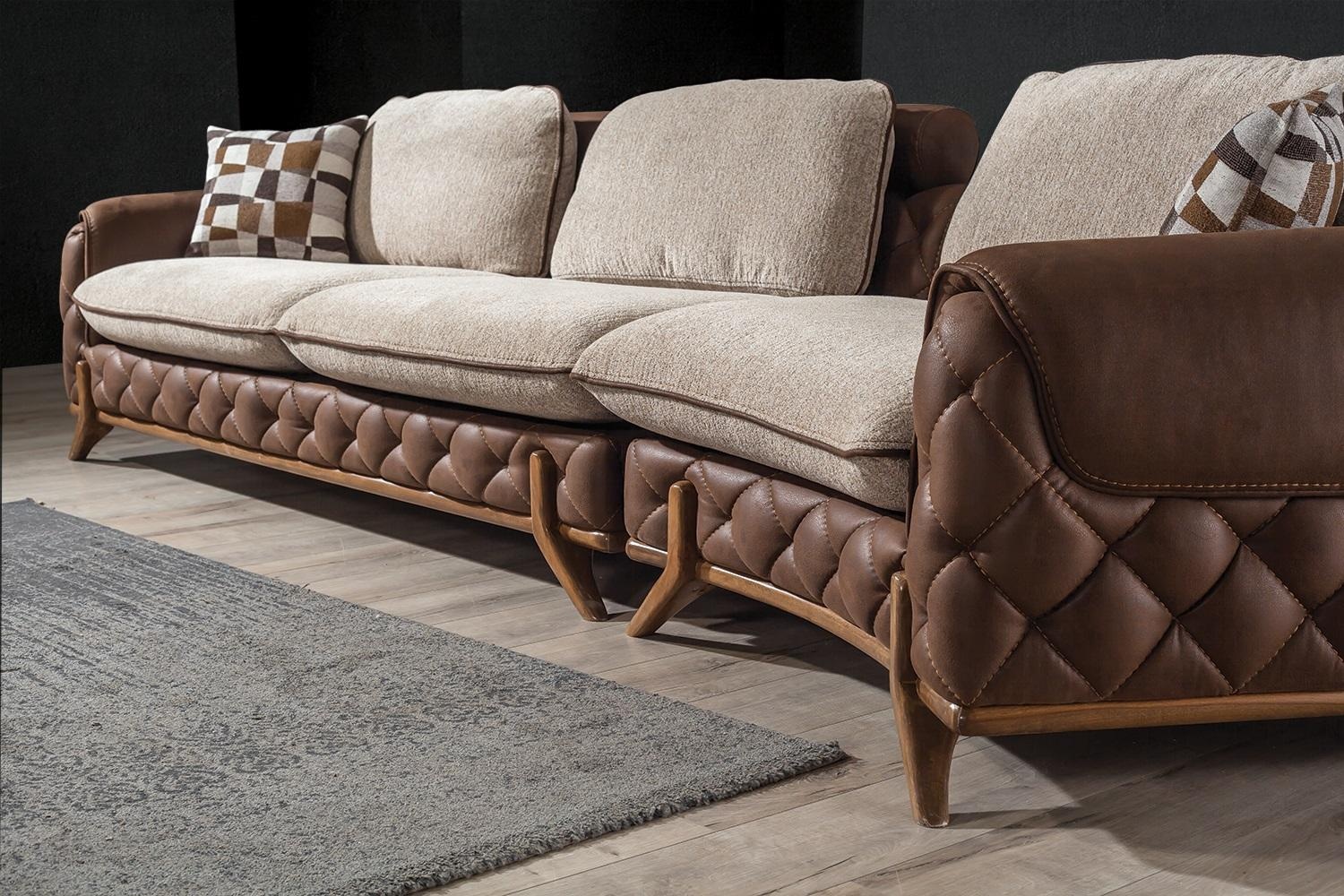 Elegancka luksusowa sofa dla 4 osób to synonim wyrafinowanego stylu i komfortu. Wykonana z najwyższej jakości brązowej tkaniny oraz skóry syntetycznej, łączy w sobie trwałość z elegancją, tworząc idealne miejsce do wypoczynku. Jej starannie zaprojektowane proporcje oraz miękkie linie nadają wnętrzu niepowtarzalny charakter, podkreślając ekskluzywność przestrzeni. Sofa, stworzona z myślą o osobach ceniących luksus, doskonale wpisuje się w nowoczesne aranżacje, oferując nie tylko funkcjonalność, ale i estetykę najwyższej klasy. Wybierając ten mebel, inwestujesz w ponadczasowy styl i komfort, które będą cieszyć przez lata.