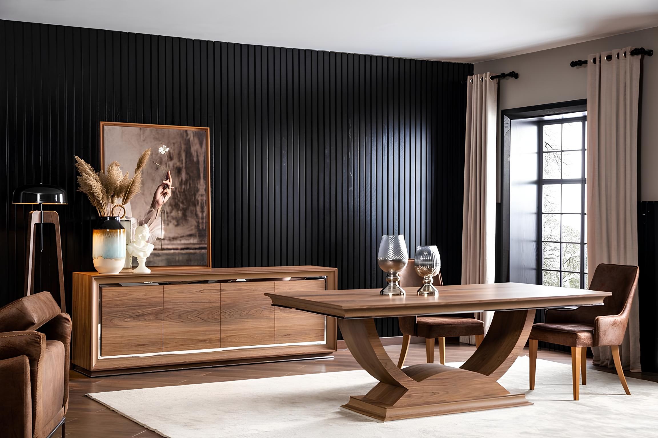 Zestaw mebli do jadalni z stołem i krzesłami to kwintesencja elegancji i wyrafinowanego stylu, który doskonale wpisuje się w ekskluzywną atmosferę Twojego domu. Wykonany z najwyższej jakości brązowego poliestru, zestaw łączy w sobie trwałość i luksusowe wykończenie, które przyciąga wzrok i zapewnia komfort. Stół, o harmonijnych liniach, staje się centralnym punktem jadalni, natomiast krzesła, starannie zaprojektowane z myślą o wygodzie, oferują niezrównane wsparcie. Ten zestaw to nie tylko meble, ale manifest stylu życia, który ceni sobie doskonałość. Wybór tego zestawu to inwestycja w unikalny design i ponadczasowy urok, który podkreśli wyjątkowość każdej chwili spędzonej w gronie najbliższych.