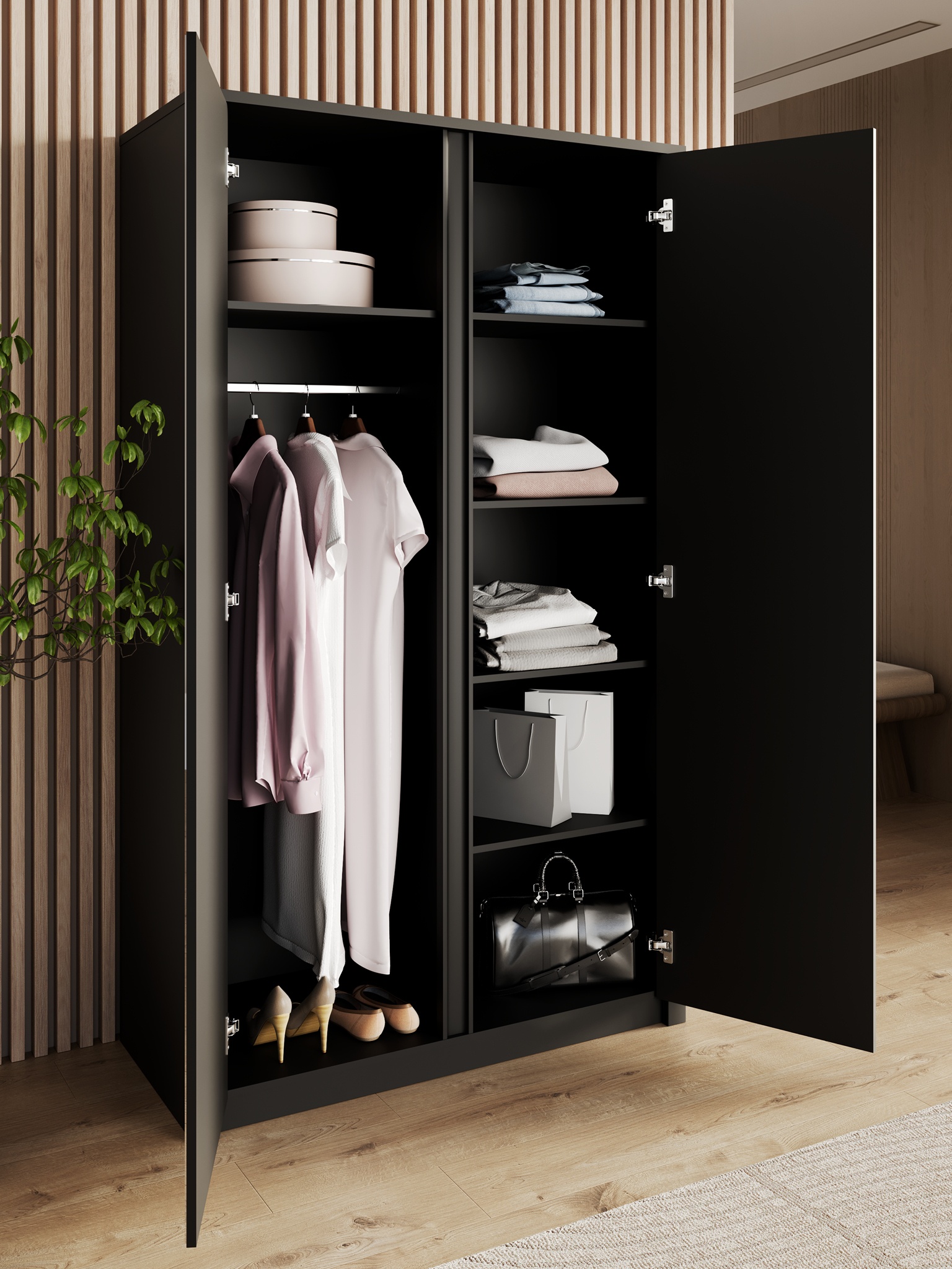 Szafa z tkaniny z lustrem i wieszakiem to kwintesencja elegancji i funkcjonalności, stworzona z myślą o wymagających klientach. Jej czarna, luksusowa tkanina doskonale komponuje się z nowoczesnym wnętrzem, dodając mu wyrafinowanego charakteru. Wbudowane lustro optycznie powiększa przestrzeń, a praktyczny wieszak zapewnia wygodne przechowywanie odzieży. Ta szafa nie tylko spełnia potrzeby organizacyjne, ale także staje się wysublimowanym elementem dekoracyjnym, który podkreśla ekskluzywny styl życia. Wybierając ten mebel, inwestujesz w jakość i estetykę, które od dwudziestu lat definiują markę oferującą luksusowe rozwiązania dla wyjątkowych domów.