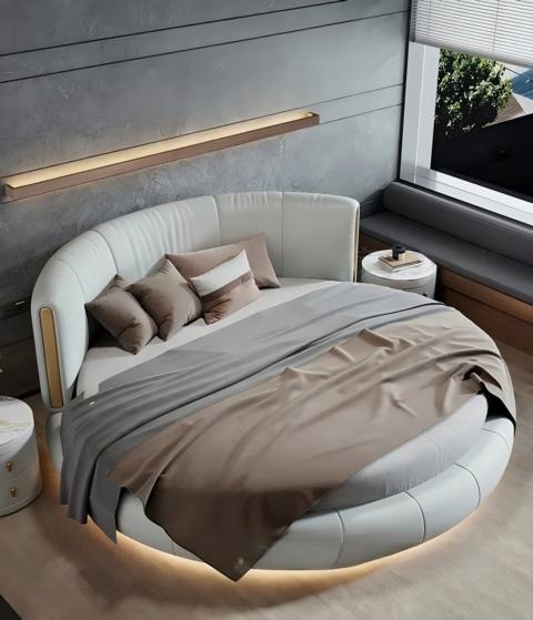Ekskluzywne okrągłe łóżko szaro-beżowe z nowoczesnym designem do sypialni | xlmeble.pl